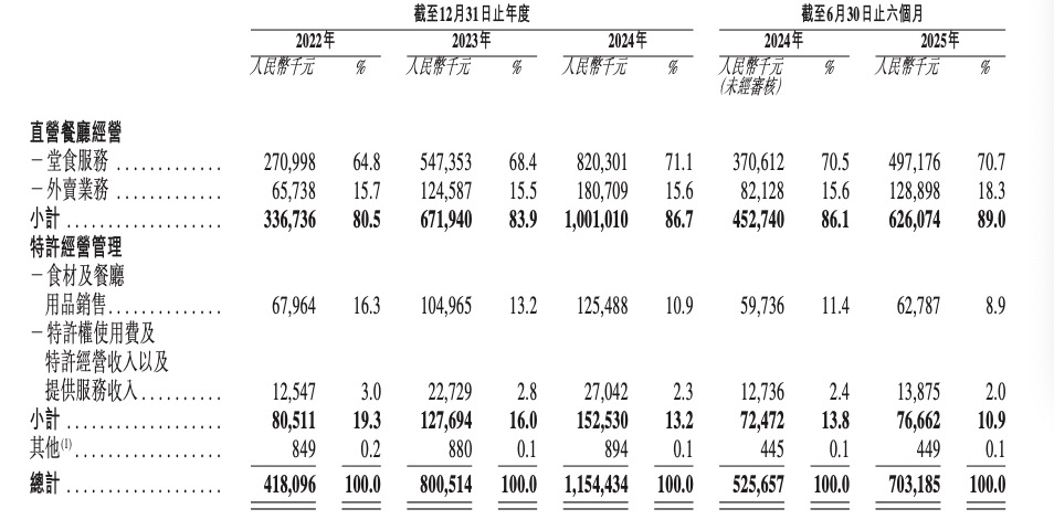 特许经营管理收入,则包括特许权使用费及特许经营收入以及向特许经营商销售食材及餐厅用品等货品及向特许经营商销售设备的收入,2022年至2024年及2025年上半年的各期占比分别为19.3%、16%、13.2%和10.9%,逐年递减。