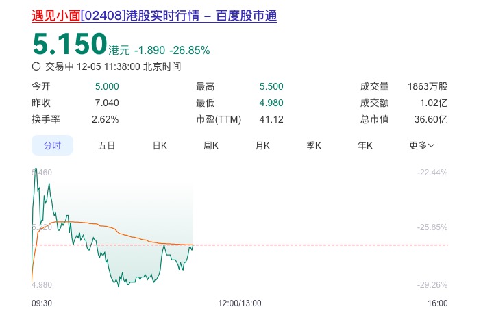 截至11.38,遇见小面股价为5.15港元/股,市值为36.6亿港元(约合33.25亿元)。