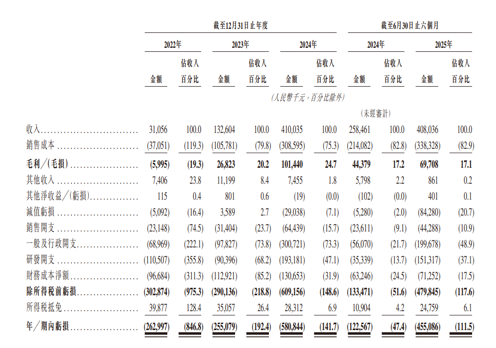 业绩方面,2022年、2023年、2024年及2025年上半年,希迪智驾营收分别为0.31亿元、1.33亿元、4.10亿元及4.08亿元,净亏损分别为2.63亿元、2.55亿元、5.81亿元及4.55亿元;经调整净亏损分别为1.59亿元、1.38亿元、1.27亿元及1.11亿元。