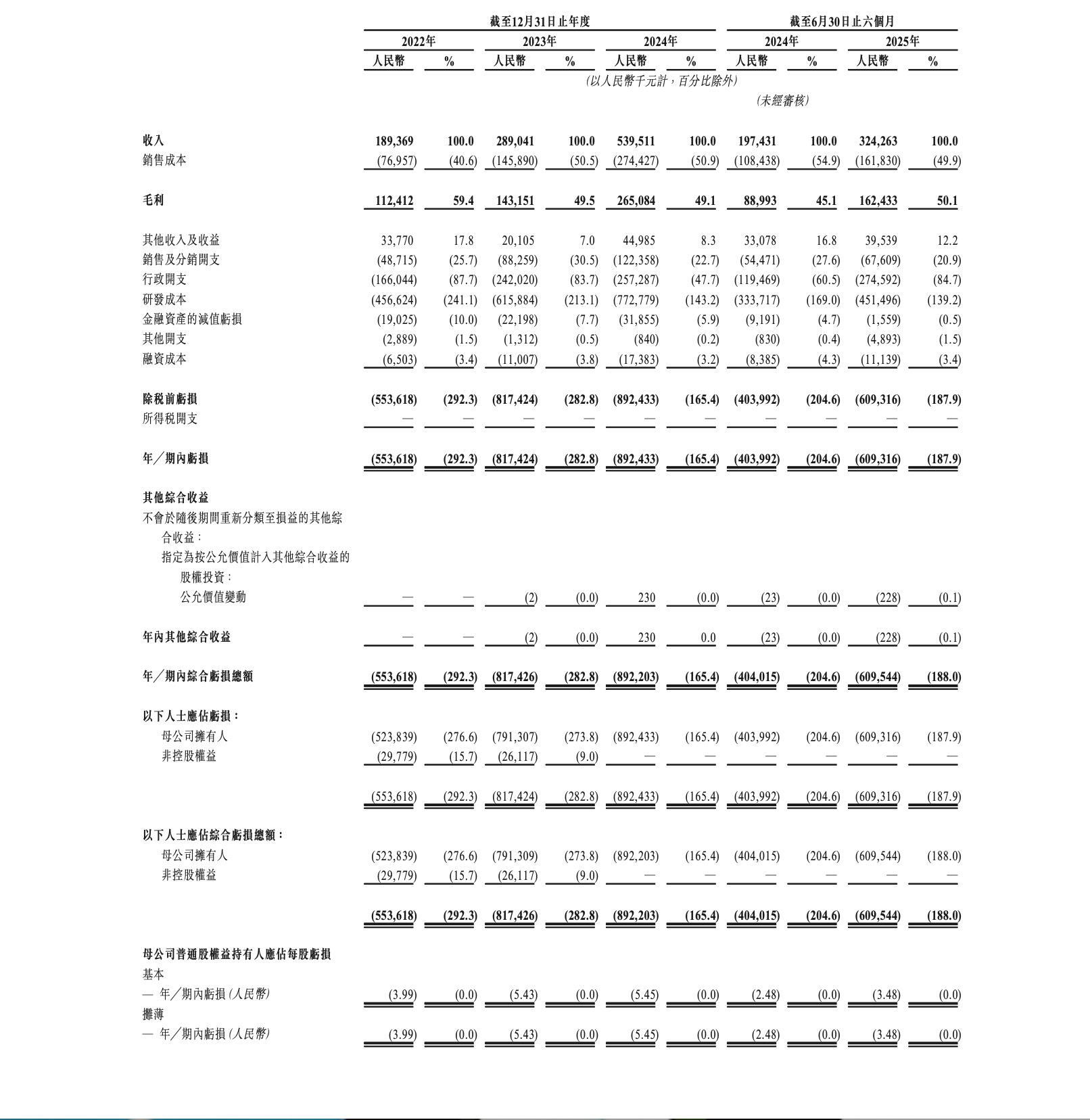 2022-2024年及2025年上半年,天数智芯的收入分别约1.89亿、2.89亿、5.40亿、3.24亿元;毛利分别约1.12亿、1.43亿、2.65亿、1.62亿元,毛利率分别为59.4%、49.5%、49.1%、50.1%;净亏损分别约5.54亿、8.17亿、8.92亿、6.09亿元,经调整净亏损分别约4.33亿、6.10亿、6.45亿、3.00亿元。