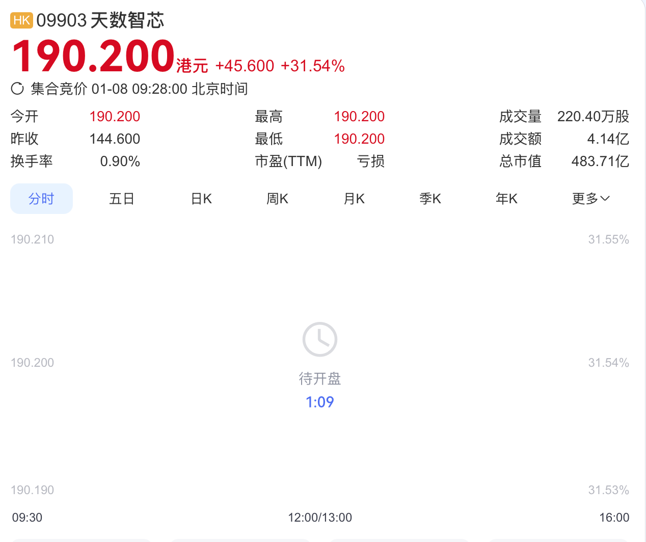 今日开盘,天数智芯大涨31.54%报190.2港元,总市值483.71亿港元。