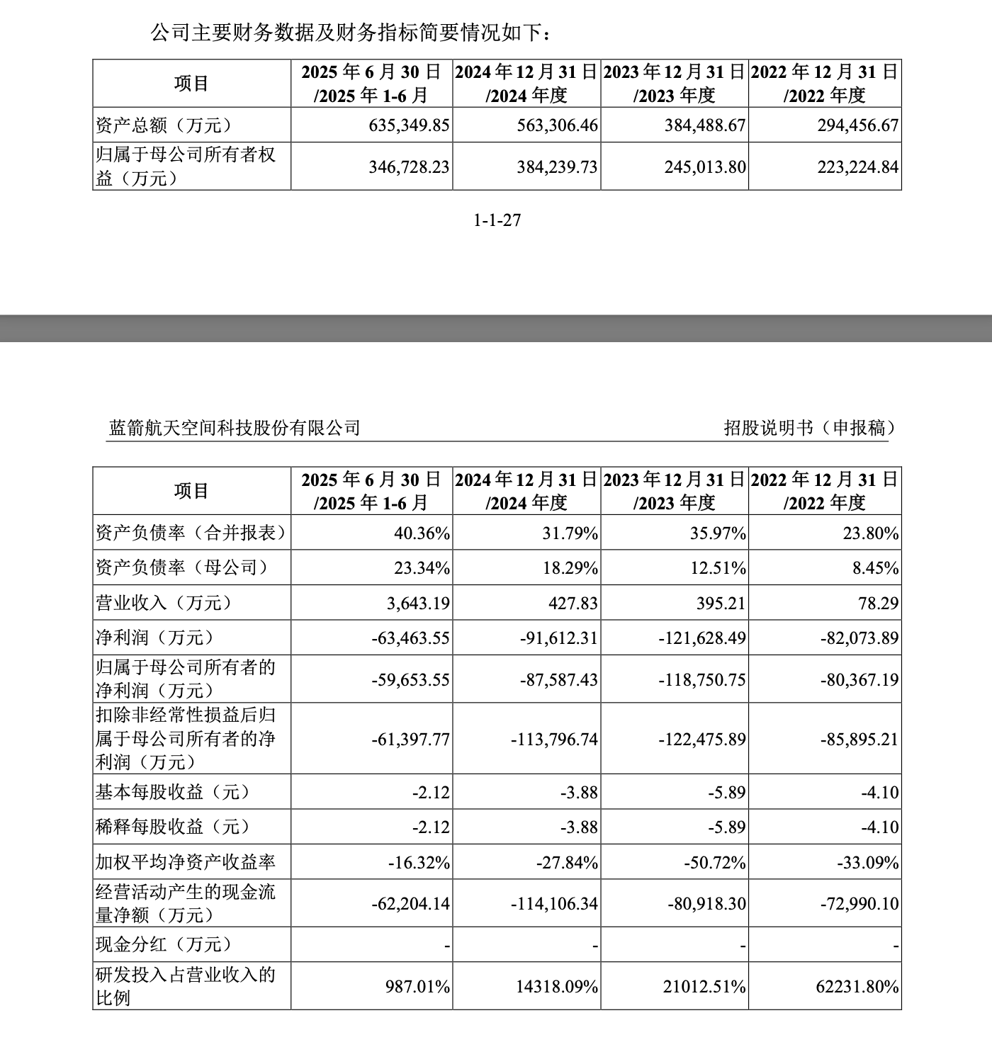 招股书显示,2022-2024年及2025年上半年,蓝箭航天的营收分别约78.29万、395.21万、427.83万、3643.19万元;净亏损分别约8.21亿、12.16亿、9.16亿、6.35亿元,三年半累计亏损约35.88亿元,与融资总额相差不大;扣非净亏损分别为8.59亿、12.25亿、11.38亿、6.14亿元。