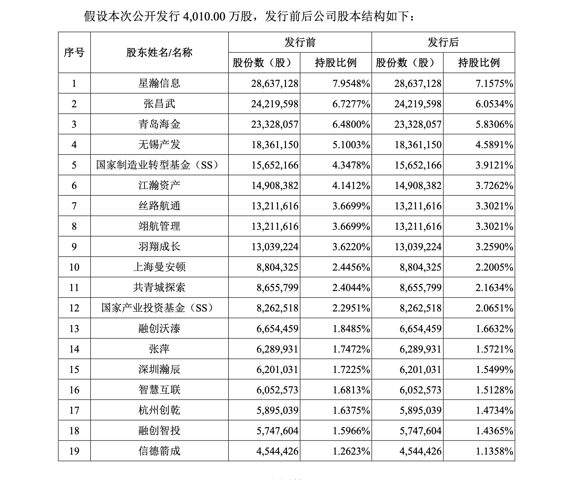 IPO后,张昌武直接持有蓝箭航天6.0534%股份;星瀚信息持股7.1575%;丝路航通、翊航管理均持股3.3021%;启宇航科持股1.0401%;航研管理持股0.2648%。