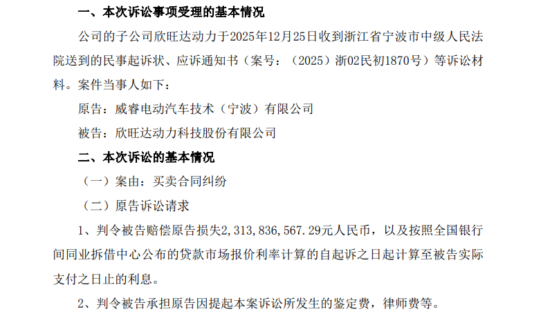 2025年底,吉利旗下的威睿电动,一纸诉状把电池供应商欣旺达的核心子公司欣旺达动力给告了,索赔金额高达23.14亿元。