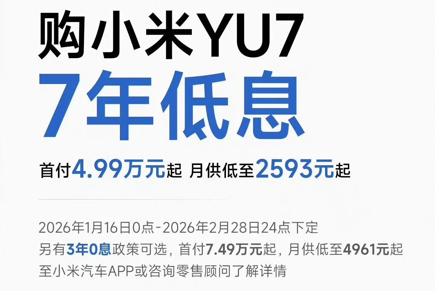 针对YU7车型,首付4.99万元起,月供低至2593元起,1月16日0点开始,截至2月28日24点前。另有「3年0息」政策可选,首付7.49万元起,月供低至4961元起。
