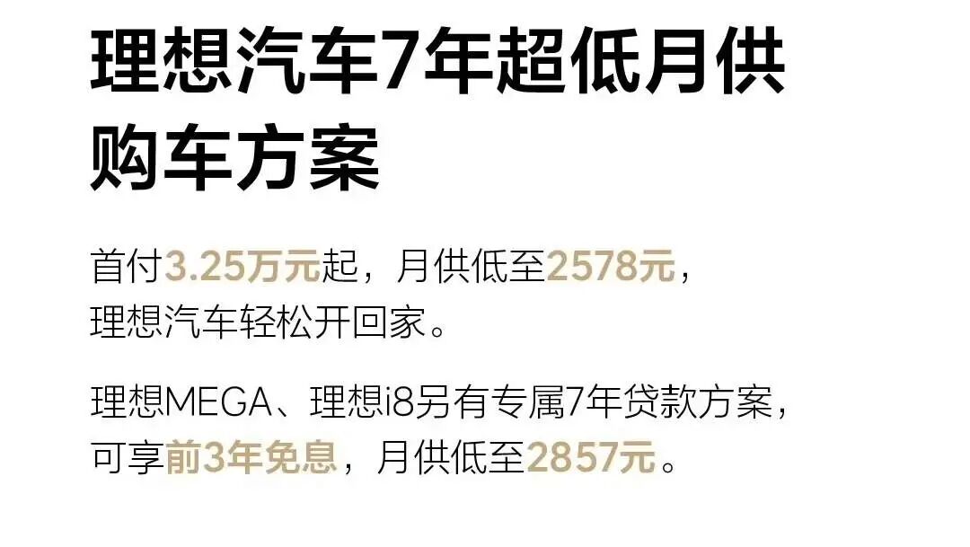 在此之前,理想汽车也发文,2026年1月20日起购车,全系车型可享7年超低月供购车方案:首付3.25万元起,月供低至2578元。另外针对MEGA与i8车型,还有专属的7年贷款方案,前三年可能享受免息优惠,月供低至2857元。