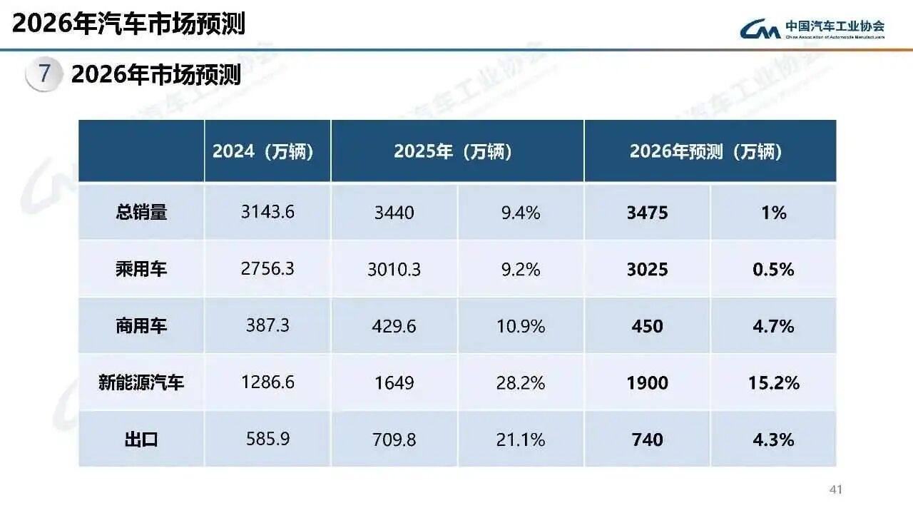 而国内方面,中国汽车流通协会分会秘书长崔东树预计,受政策退坡影响,2026年乘用车销量将降至2380万辆,同比下滑2.1%;中国汽车工业协会也认为若政策持续托举,市场或能维持1%-3%的微增;若情况不佳,则可能原地踏步。