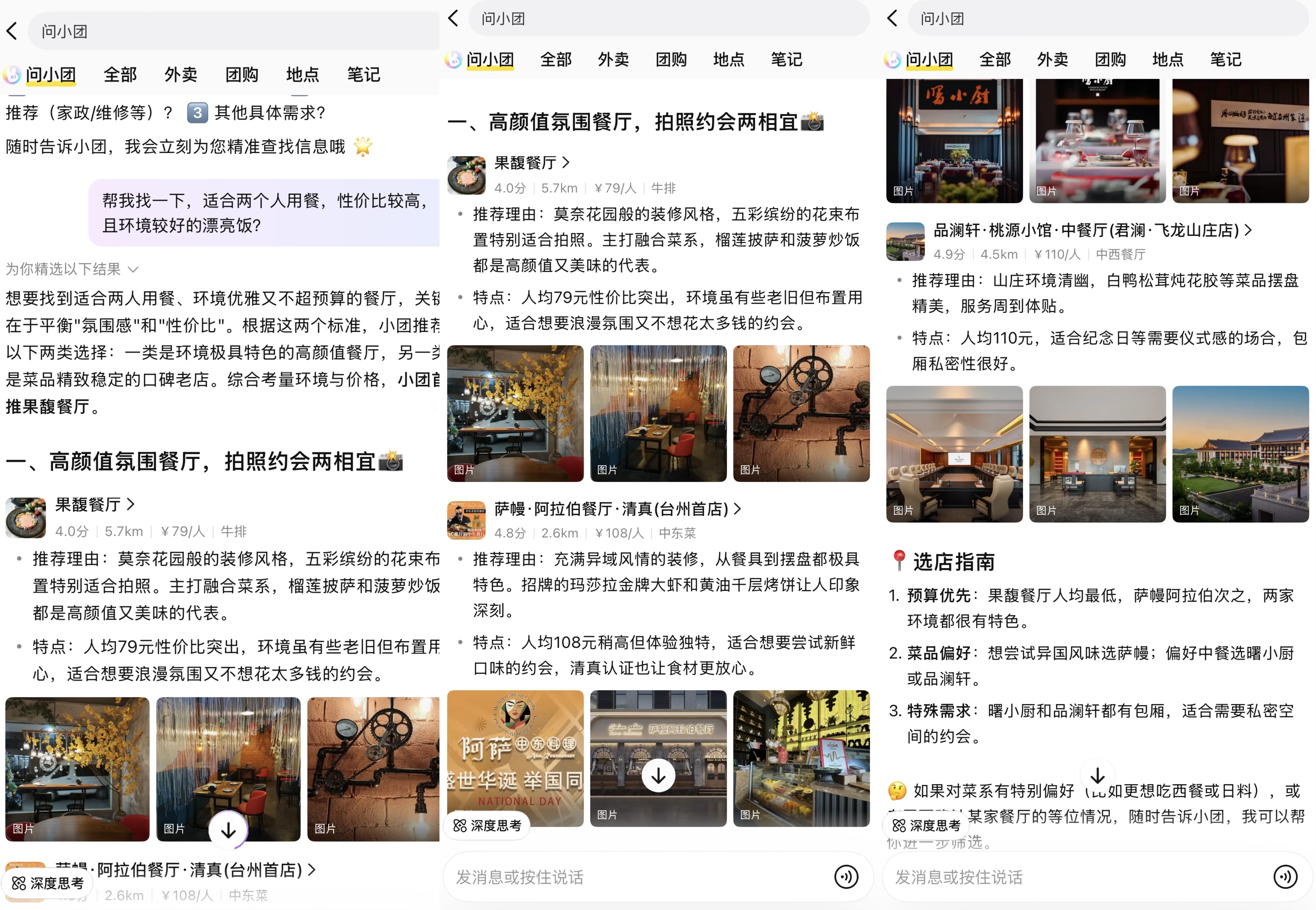 随后,问小团便快速进行了解读,并找到了平衡“氛围感”和“性价比”这一关键点,不仅给出了环境极具特色的高颜值餐厅跟菜品精致稳定的口碑老店两类选择,还综合考量环境与价格,给出了小团首选的餐厅选择,点击便可进入团购页面。