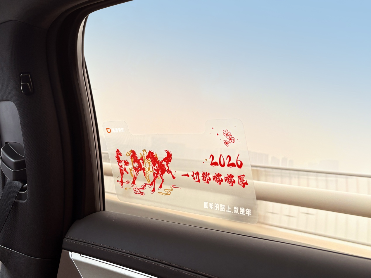 专车的车窗花上刻有象征福禄的葫芦、徐悲鸿笔下奔腾的骏马、绚烂的烟花和象征春天的燕子等喜悦欢快的元素,今年的车窗花不仅在设计上做了升级,还在部分城市定制了方言版车窗花。在泉州,定制版车窗花“2026,一切都嘟嘟厚”,则正是滴滴为专车司机和乘客送上的一切都“刚刚好”的祝福。