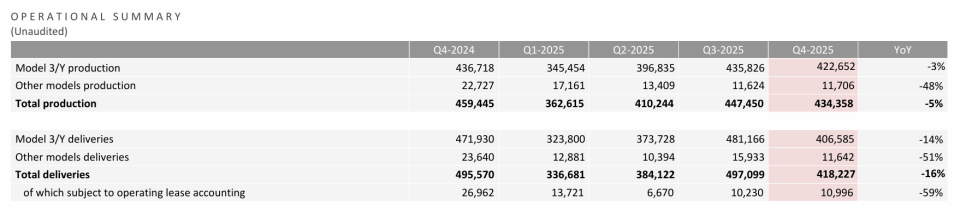 2025年第四季度,特斯拉在全球交付了41.8万辆汽车,同比下降16%。整个2025年,累计交付量为163.6万辆,同比下降8.6%。这也是特斯拉历史上,首次出现年度交付量下滑,全球电动车销冠的宝座也被比亚迪夺走。
