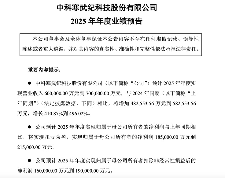 寒武纪1月30日公告显示,预计2025年年度实现营业收入60亿元到70亿元,与2024年同期相比,将增加48.26亿元到58.26万元,增长410.87%到496.02%。