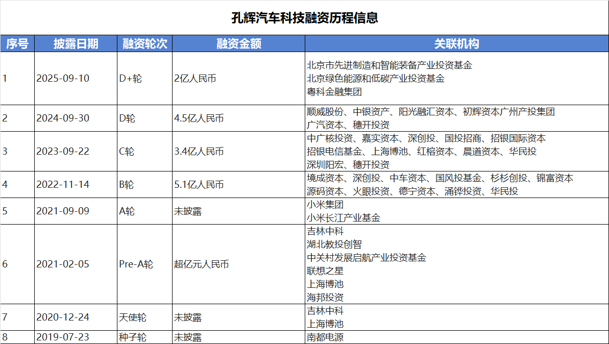 据悉,在2025年9月份,孔辉科技完成2亿元D+轮融资,投资方包括北京市先进制造和智能装备产业投资基金(有限合伙)、北京市绿色能源和低碳产业投资基金(有限合伙)、广东粤科资本等,投后估值约67亿元。