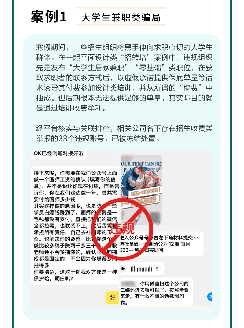 在公告中,安全团队重点提示了大学生寒假兼职的相关招转培骗局——招生组织以招聘兼职设计之名,以“大学生居家兼职”“零基础可做”“提供保底单量”等噱头,诱导学生群体付费参加培训,但实际学生付费培训后,并不能得到此前招生组织承诺的单量。