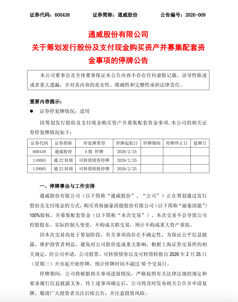 为保证公平信息披露,维护投资者利益,避免对公司股价造成重大影响,根据上海证券交易所的相关规定,通威股份股票、可转债债券以及可转债转股自2026年2月25日开市起开始停牌,预计停牌时间不超过10个交易日。