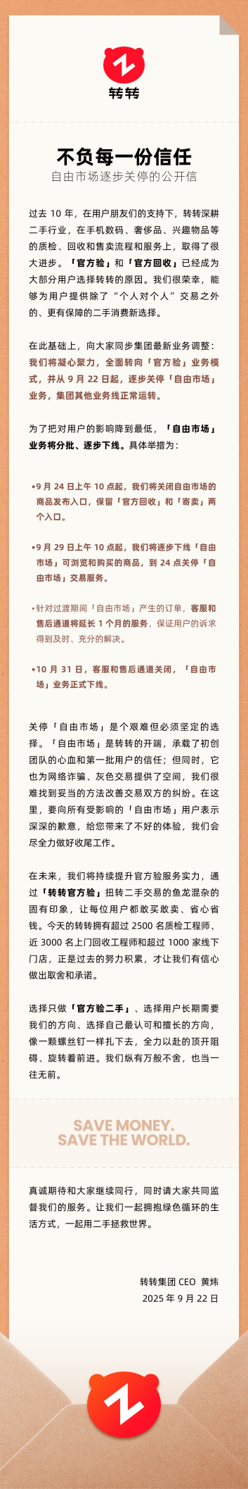 附转转集团CEO黄炜致用户信全文: