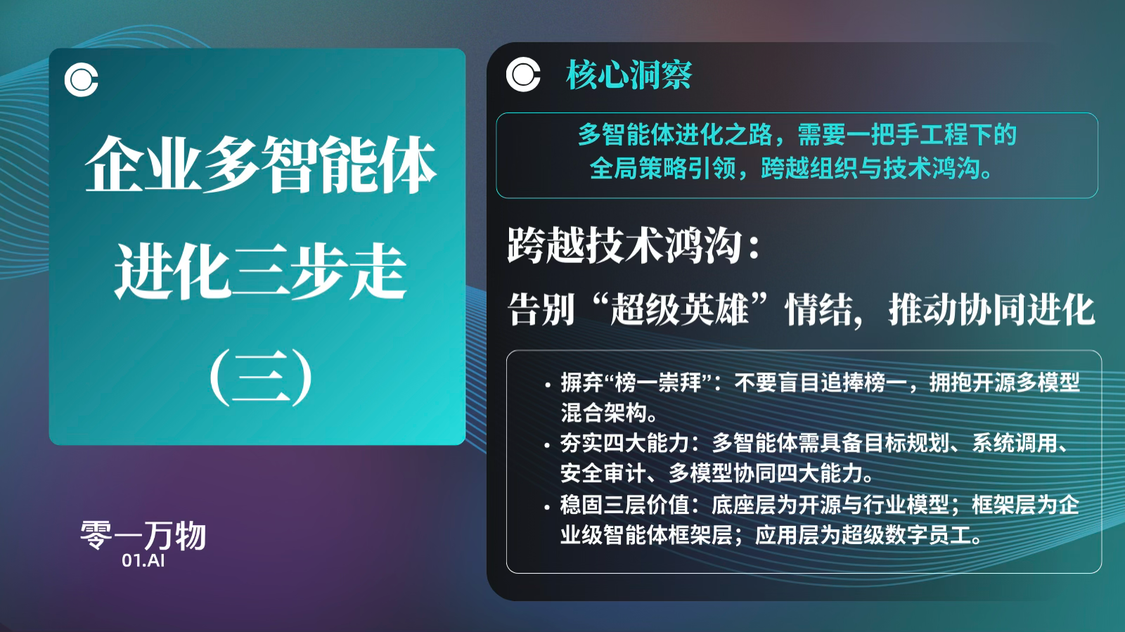 零一万物技术与产品中心副总裁赵斌强表示,从去年战略转型全面聚焦ToB市场后,零一万物核心技术团队不断进行用AI驱动企业组织基因进化的实验,印证了零一万物的核心预判:多智能体正推动企业从“人才依赖”转向“能力软件化”。当智能体在每次人机交互中沉淀决策逻辑,企业便能将顶尖人才的隐性知识转化为可复制的数字资产。但技术只是起点,真正的变革在于组织心智,企业必须打破部门墙,以一把手工程加速企业AI数智化转型,从而真正拥抱新质生产力。