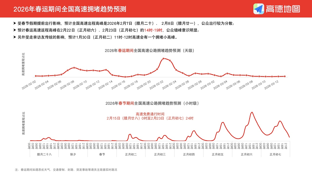 报告预测,今年春运出行将呈现节前节后“双高峰”形态。节前出程高峰预计在2月7日、2月8日(腊月二十、腊月二十一),而节后返程高峰则预计出现在2月22日、2月23日(正月初六、初七)下午。此外,受传统走亲访友习惯影响,正月初二(2月18日)中午时段或将出现短暂的拥堵小高峰。