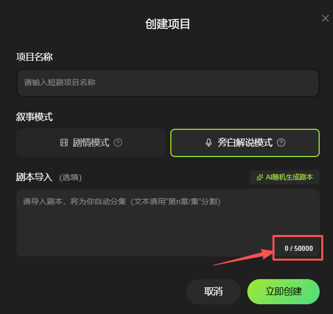 剧本导入为选填项,无剧本时可点击“AI随机生成剧本”快速获取素材;也可导入5万字以内的超长剧本,系统会按“第1章”或“第1集”的指定关键词自动分集。