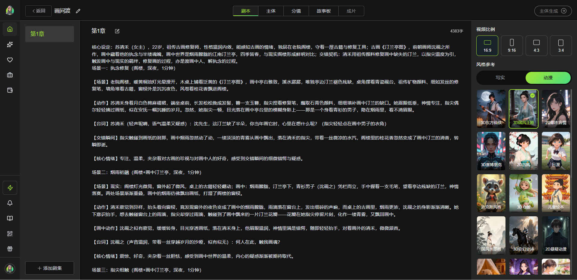 2、主体形象生成:剧本确认后,选择视频比例与风格,系统会自动识别并提取其中的角色、场景、道具,同时自动完成主题图片提示词撰写。