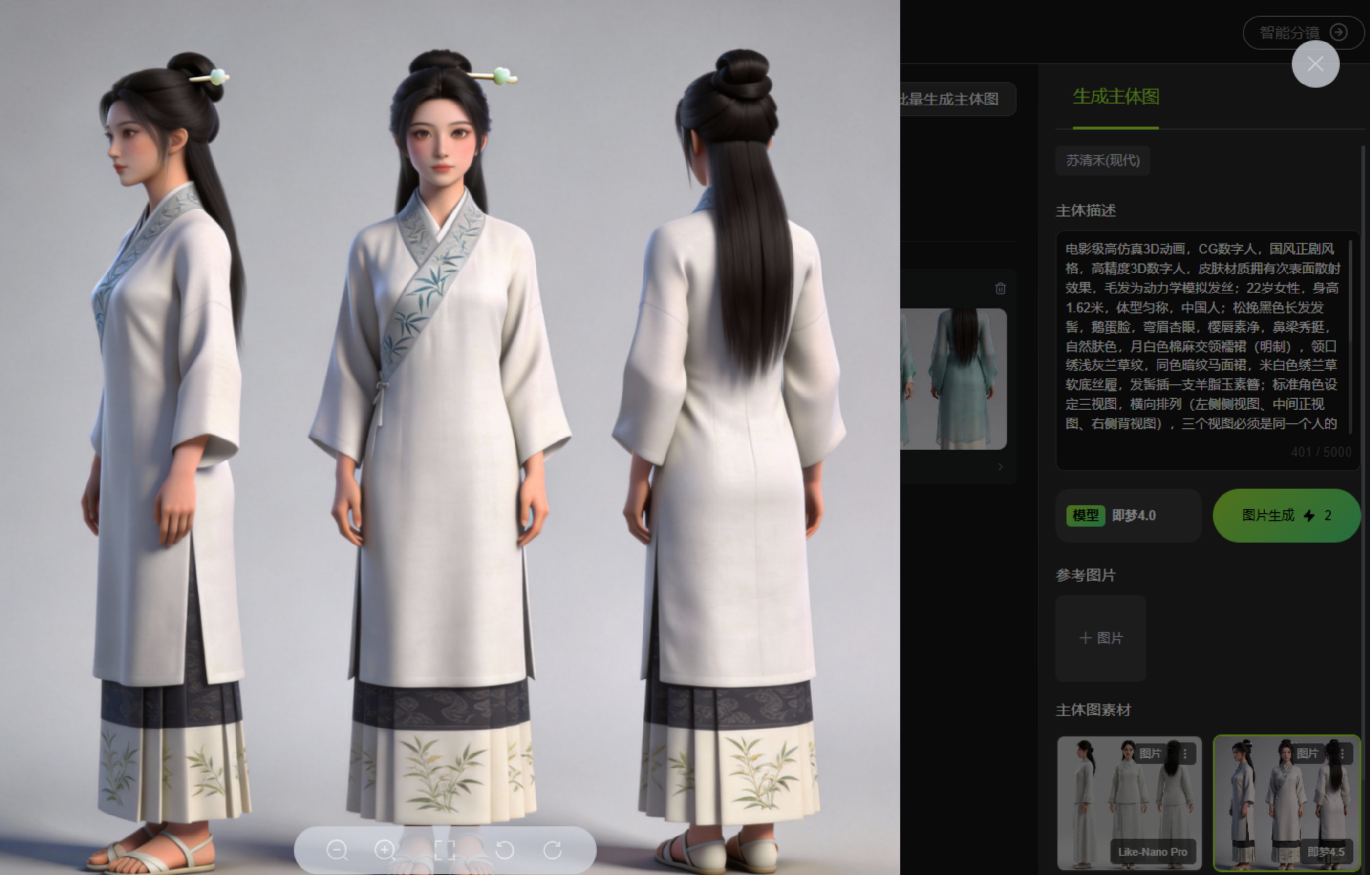 支持生成角色三视图、道具多角度视图,可上传参考图辅助生成,也能直接上传现成主体图片;