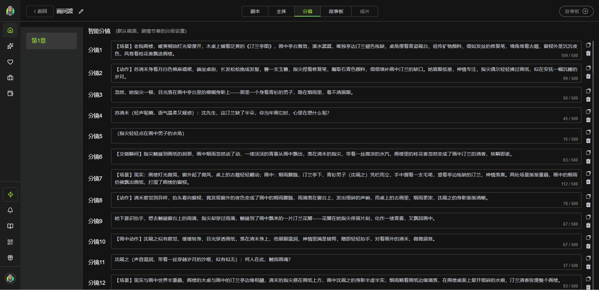 可根据需求对分镜进行复制、新增、删除操作,无需专业分镜知识也能精准掌控叙事节奏,尤其适配超长剧本的批量分镜处理。