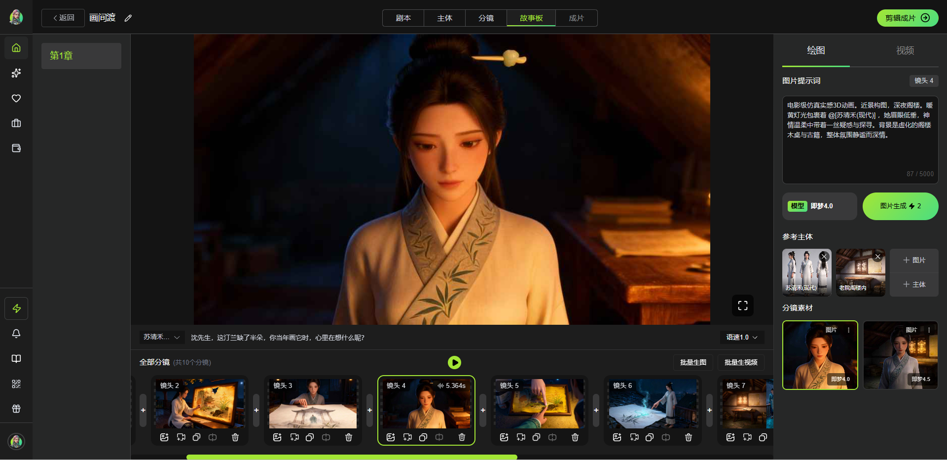 用户还能调节当前分镜的语速、语调、音量(改动后需点击“试听”生效),也可选择空镜、旁白或对话角色模式(选择空镜会自动清空对白内容)。