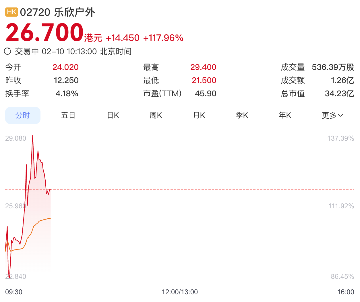2 月10日,乐欣户外国际有限公司(简称“乐欣户外”)登陆港交所,发行价为每股12.25港元,开盘涨96.08%至24.02港元,总市值30.79亿;截至发稿,每股涨117.96%至26.7港元,总市值34.23亿。