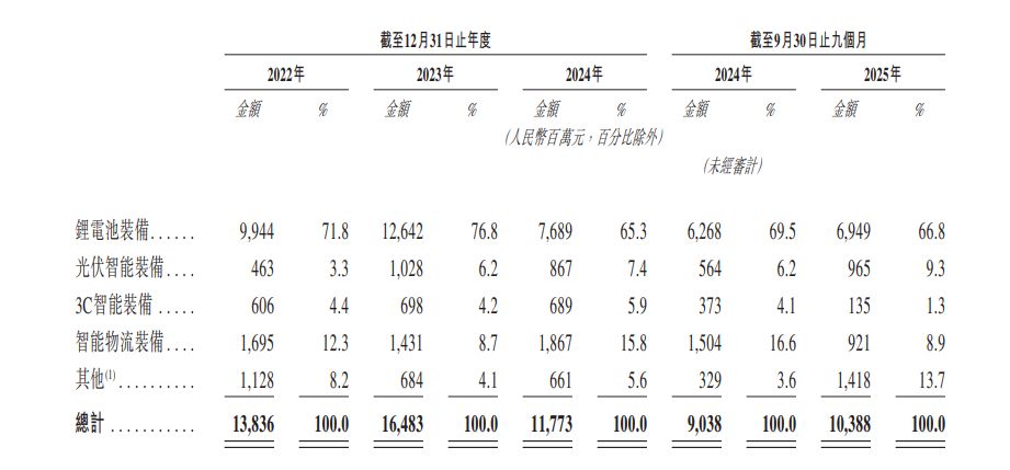 从收入构成来看,先导智能收入主要来自锂电池装备、光伏智能装备、3C智能装备、智能物流装备等,其中锂电池装备贡献主要收入。招股书显示,2022年、2023年、2024年及2025年前三季度,先导智能该业务营收分别为99.44亿元、126.42亿元、76.89亿元及69.49亿元,分别占同期总营收的71.8%、76.8%、65.3%及66.8%。