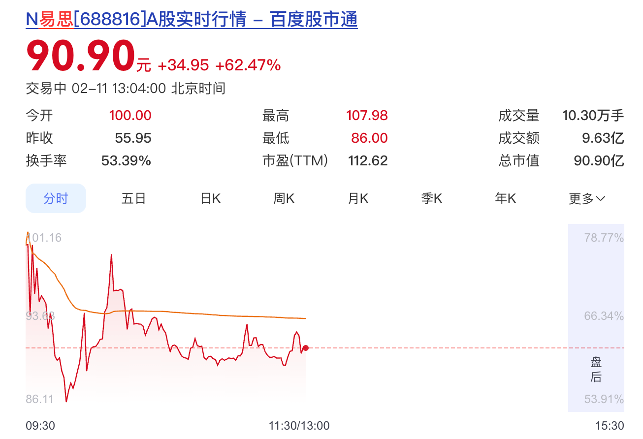 2月11日,易思维(杭州)科技股份有限公司(简称易思维)正式在科创板挂牌上市,发行价为每股55.95元,开盘涨78.73%至100元,总市值100亿;截至发稿,每股涨62.47%至90.90元/股,总市值90.90亿元。